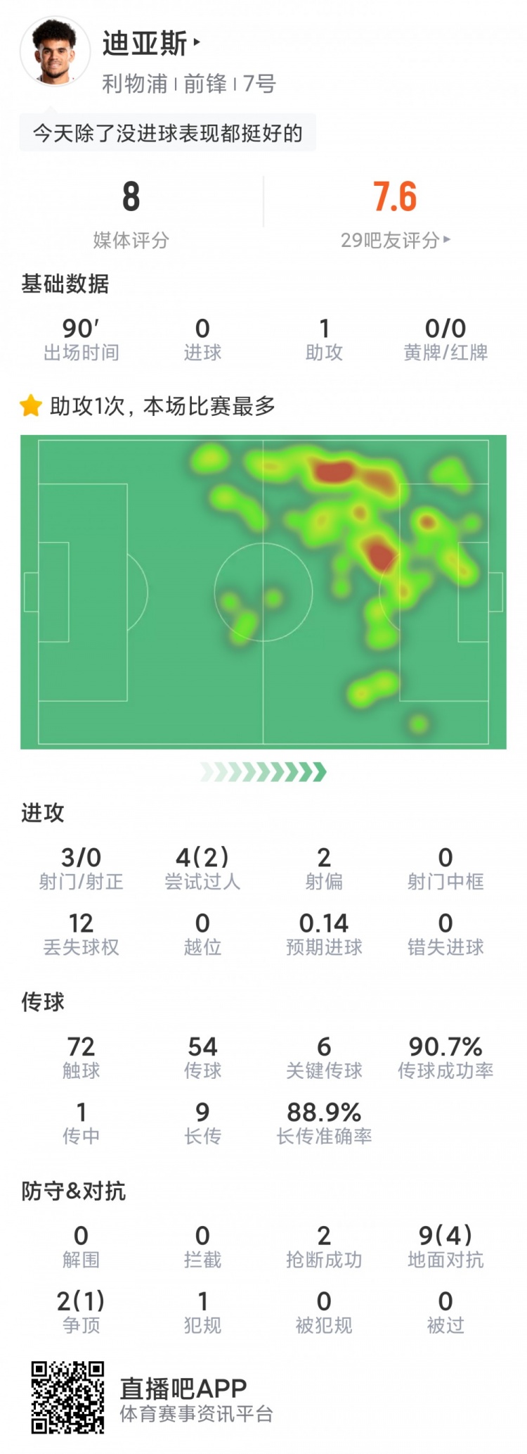 4月5日讯 在本轮英超利物浦3-1击败谢菲联的比赛中,迪亚斯有不俗表现,以下为他在本场数据: